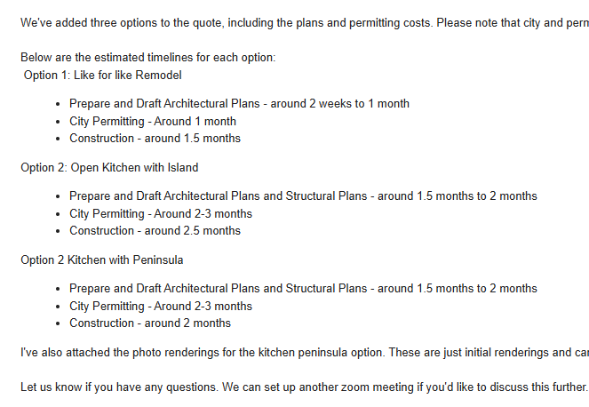 +Project timelines vary based on scope and complexity. A bathroom renovation typically takes 3-4 weeks, while a kitchen might take 4-6 weeks. Full home renovations can range from 3-6 months. During our initial consultation, we'll provide a detailed timeline specific to your project.
